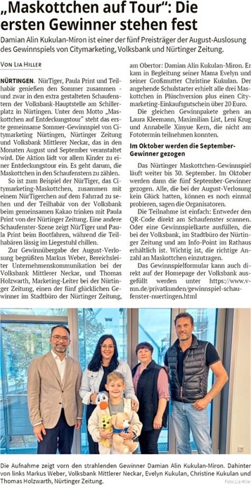 Unter dem Motto „Willkommen bei Paula Print, NürTiger und Teilhabär!“ startet im August eine Mitmachaktion in Nürtingen. In Kooperation mit dem Verein Citymarketing Nürtingen, der Nürtinger Zeitung und der Volksbank Mittlerer Neckar eG lädt die Aktion vor allem die Kinder zu einer Entdeckungstour durch die Schaufenster der Volksbank-Hauptstelle am Schillerplatz ein. Ziel ist es, die drei Maskottchen – Paula Print, NürTiger und TeilhaBär – in den Schaufenstern zu entdecken und zu zählen. Die Teilnahme ist ganz einfach: